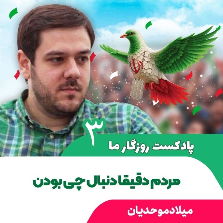 ارائه روایتی مستند و منصفانه از تاریخ ایران پس از انقلاب کاری از آقای میلاد موحدیان دانش آموخته دکتری جامعه شناسی سیاسی و پژوهشگر حوزه تاریخ معاصر ایران به کمک دوستانش با موضوع «پادکست روزگار ما»، جلسه سوم، مردم دقیقا دنبال چی بودن،سال 1403